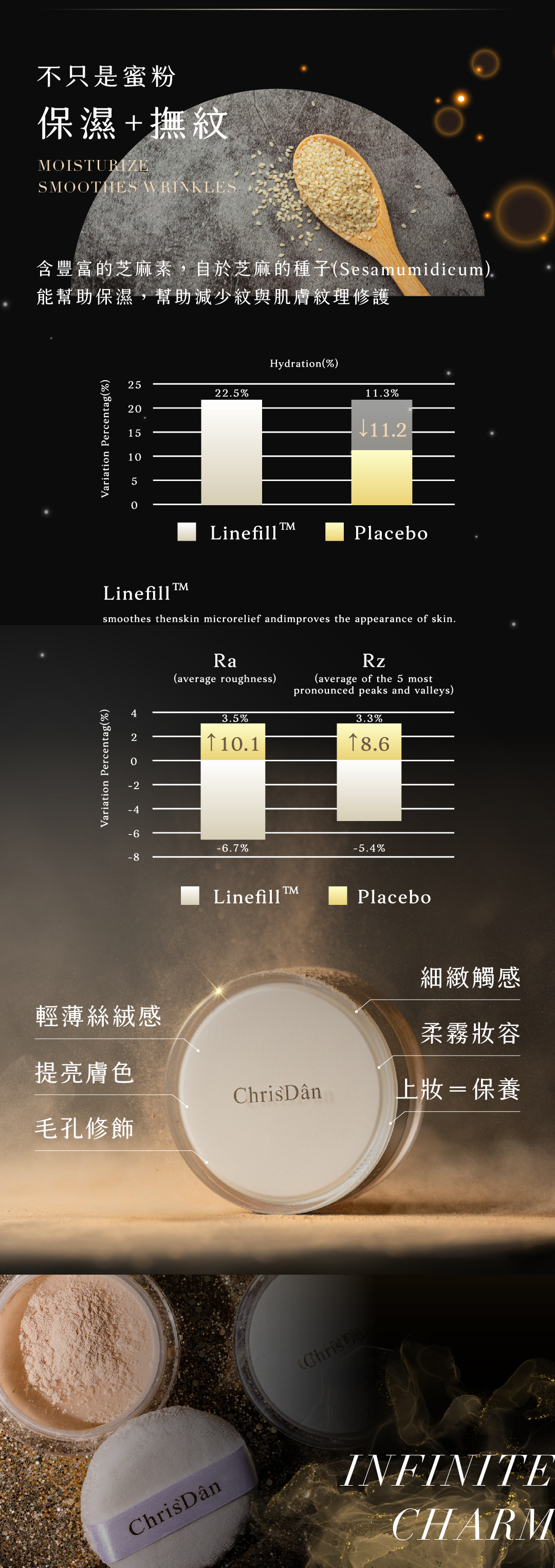 含豐富芝麻素源自於芝麻種子(Sesamumidicum)使粉體更加服貼持久光采無瑕蜜粉使用方式: